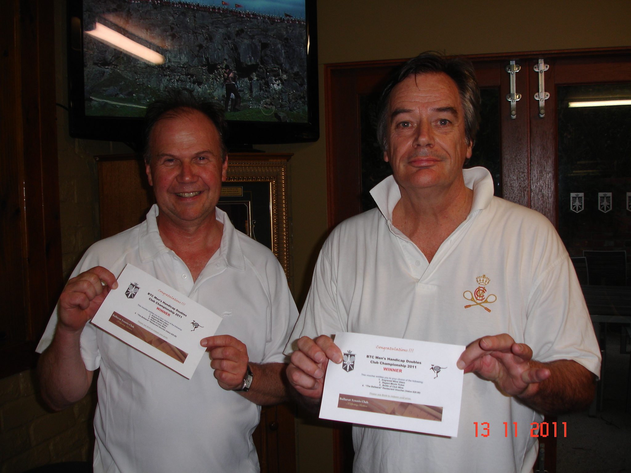 Rob Jolly has dicky hips, dodgy knees, a dicey back, his right humerus detached from the scapula and he’s not getting any younger … and that’s before he spent the weekend on court in the Doubles. No wonder he needed a doctor as a partner; his whole skeletal frame could have dislocated at any moment. In fact the only bit of him working properly was his right wrist but that was all he needed … apart from Greg Henderson that is. In a group that had the unlikely outcome of the three top pairs having the same score, they win on a count back. Fuelled by anti-inflammatory drugs Rob and Greg take out the finals in close matches with Rod & Ben and Bill & Jon and are crowned worthy Club Champions. Well done … a triumph for the right wrist and medical science.
