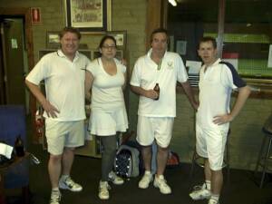 “The Cone’s gone pear-shaped!” … you could feel Brett’s anguish even as you admired the aptness of his geometrical metaphor. Oh dear … for the third year in a row Hobart Royal Tennis Club is a no-show for the scheduled tournament. Admittedly there have been plausible excuses … their eccentric use of the Julian Calendar is well documented and last year there was that doctor’s certificate for thermophobia. Whatever the reason our cracked BTC team of Rob Jolly, Rod Unmack, Stuart and Annie Strange were distraught and competition had to be found for them. Leave it to Brett to find a little Tasmanian in all of us … if you could spell Launceston, drank pinot or were slightly inbred … you were commandeered into an ersatz Tassie Team and the Cone was played after all … well sort of.